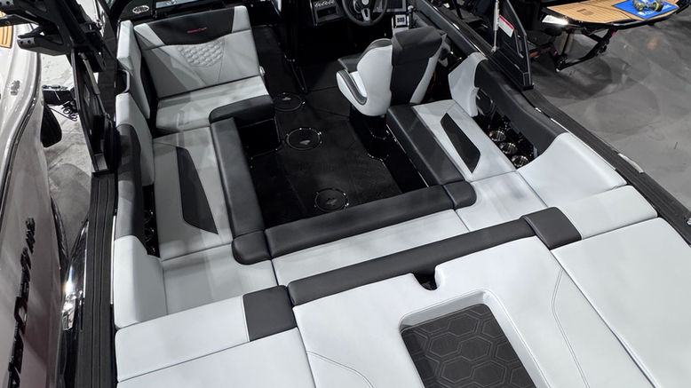 The boat can comfortably seat up to 11 people and includes features like ample storage, an advanced audio package